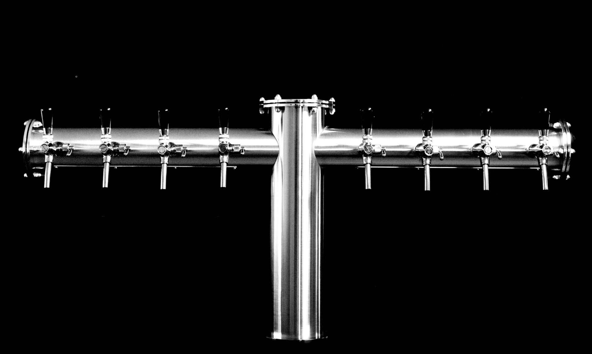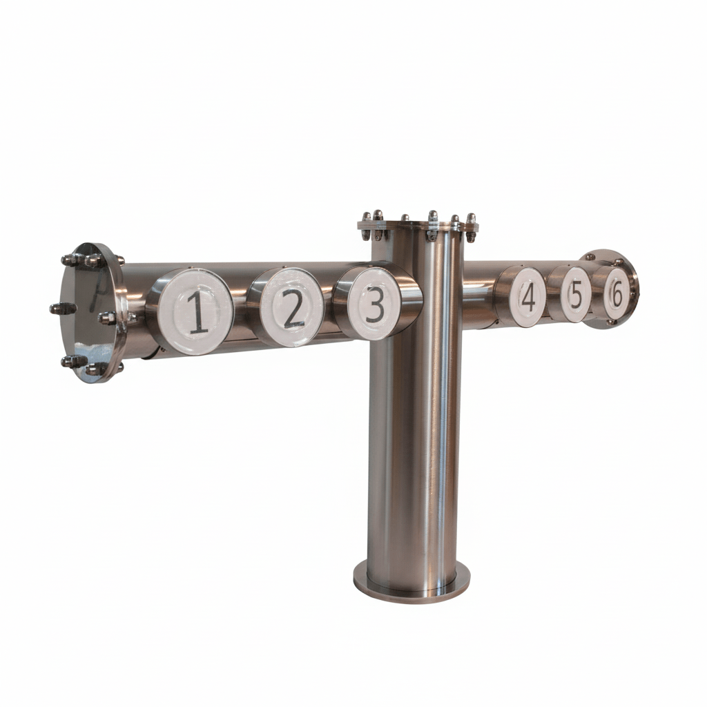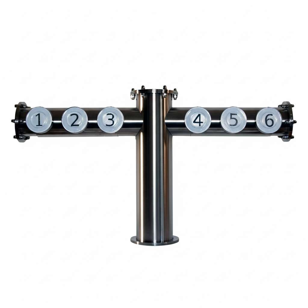 Surowa elegancja w formacie T to propozycja dla lokali, które stawiają na nowoczesny, techniczny design i bezkompromisową jakość materiałów. Kolumna została wykonana z litej stali nierdzewnej o imponujących średnicach rur (101,6 mm lub 129 mm). Brak powłok galwanicznych czy chromowania sprawia, że produkt jest praktycznie niezniszczalny i odporny na zarysowania oraz intensywną chemię czyszczącą. Symetryczna budowa typu „T” zapewnia barmanowi wygodny dostęp do wielu kranów jednocześnie, co jest kluczowe przy dużym natężeniu ruchu.
